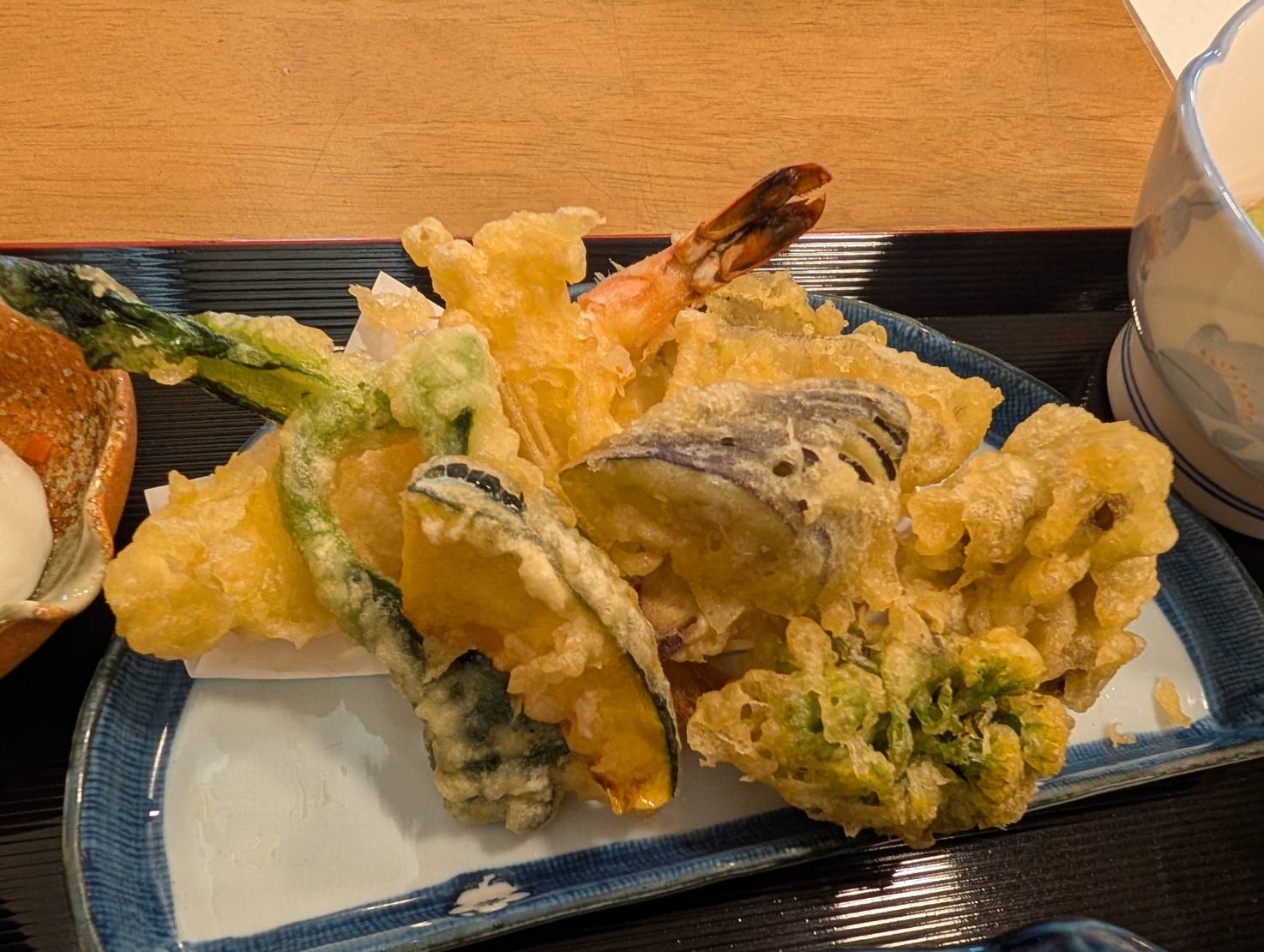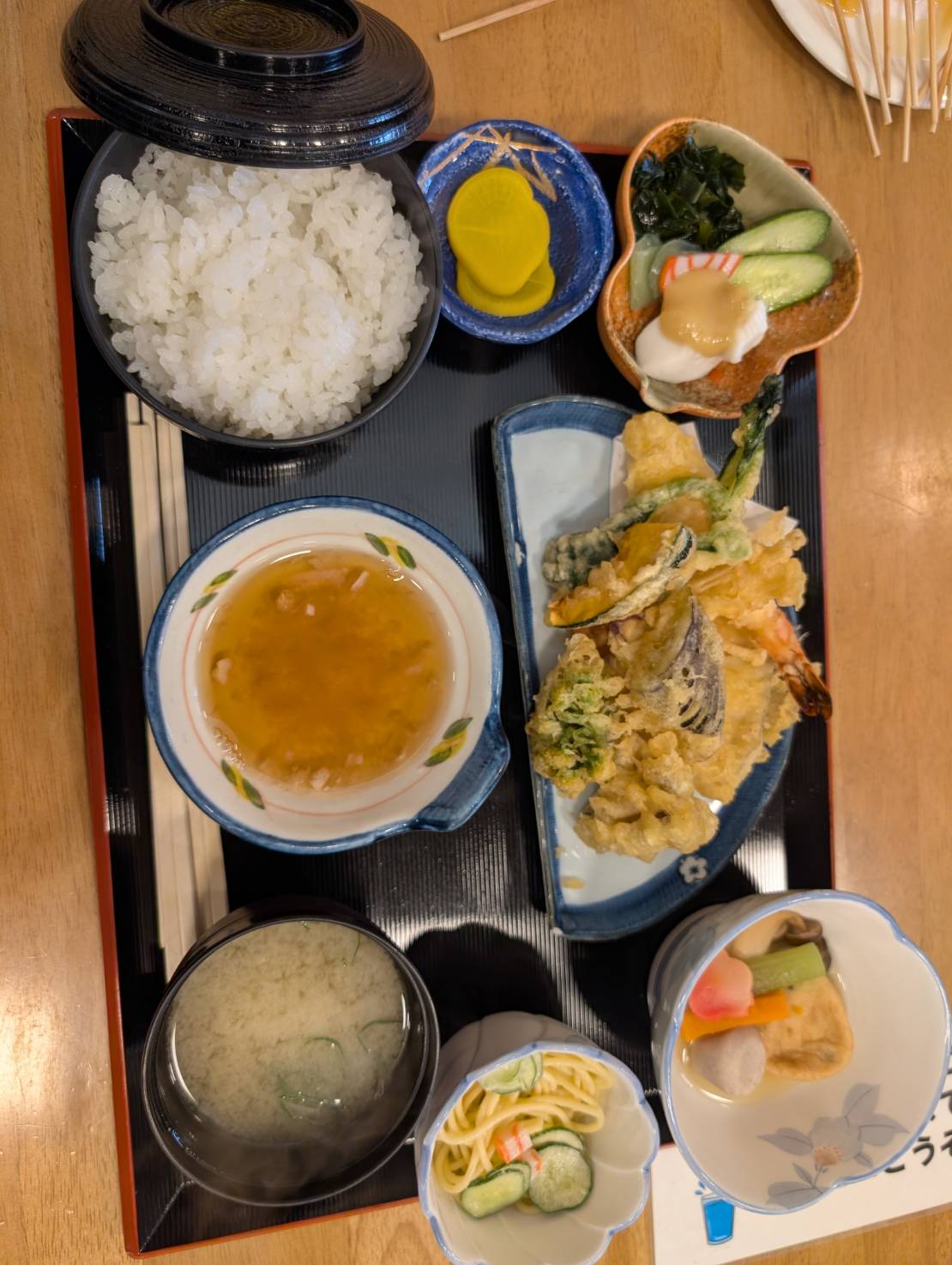 ごはんみそ汁と、ドーンと天ぷら盛り合わせ。