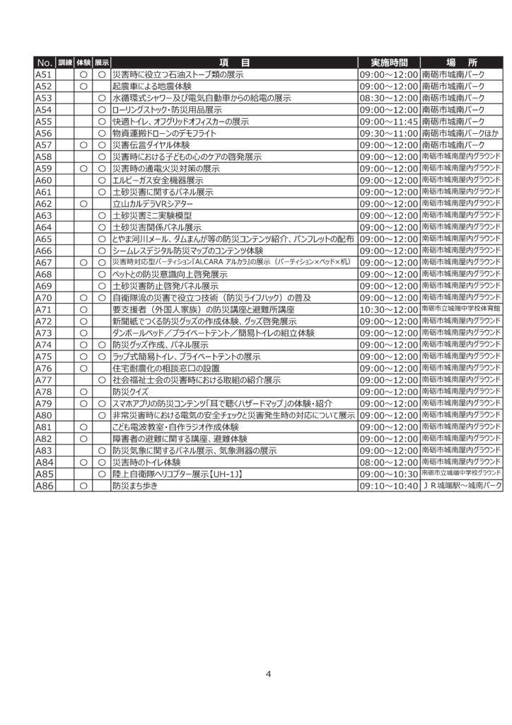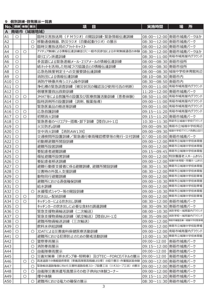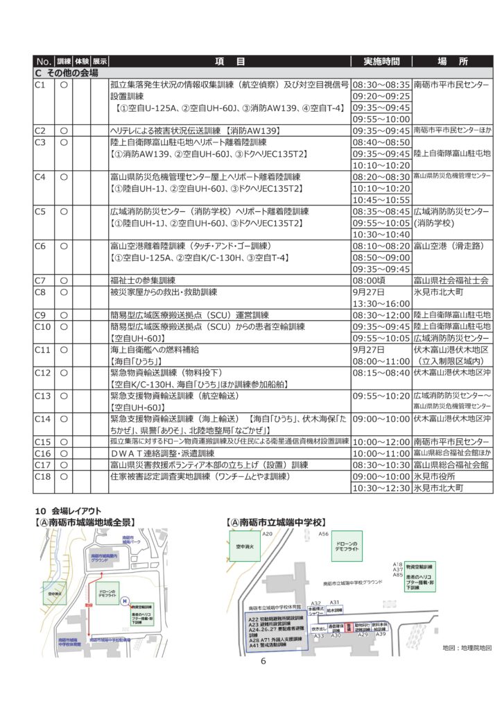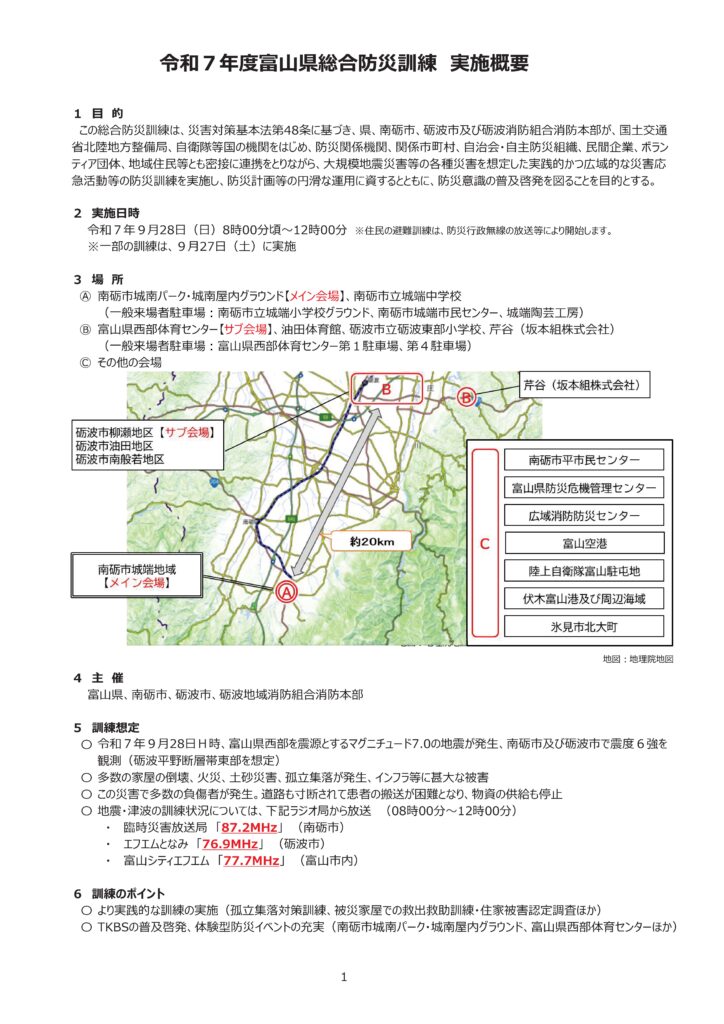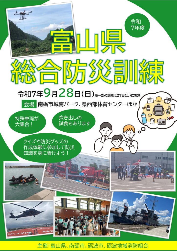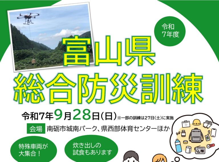 防災フェアが開催されましたが、大きな規模での防災訓練が、令和7年9月28日(日)に、南砺市城端地域がメイン会場にて行われるようです。