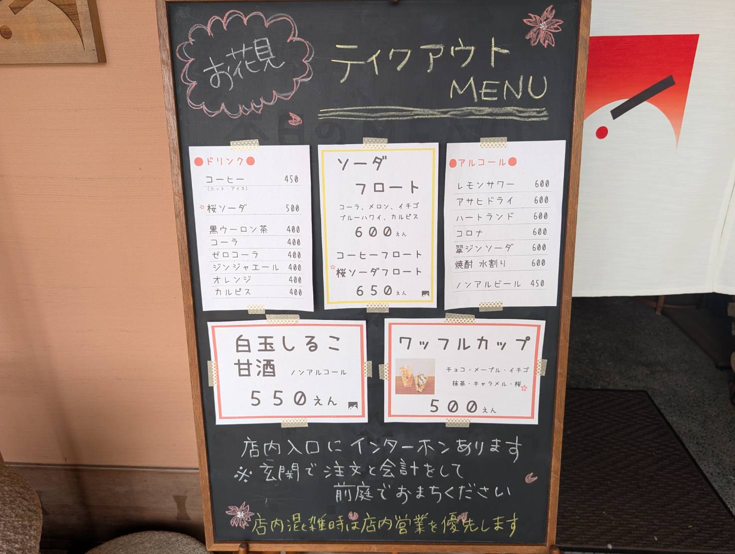 テイクアウトメニューもあり、飲みながら桜並木の下を散策するのもいいですね。(ごみは持ち帰らなきゃですね)