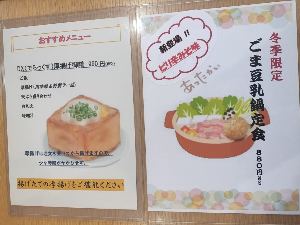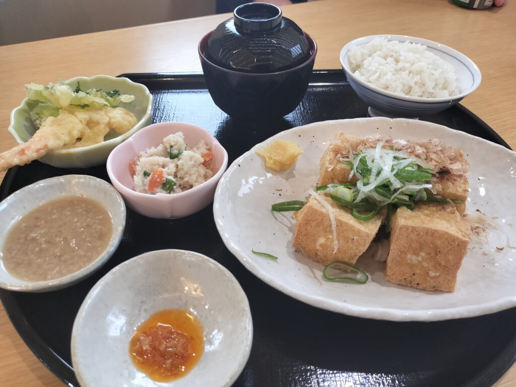 外はカリッと、中はフワフワの厚揚げは、薬味や削り節、そして肉味噌などで、様々な食べ方を楽しめます。DX定食には海老天などの天ぷらも付いてきて、揚げたてを満喫できる贅沢な内容です。