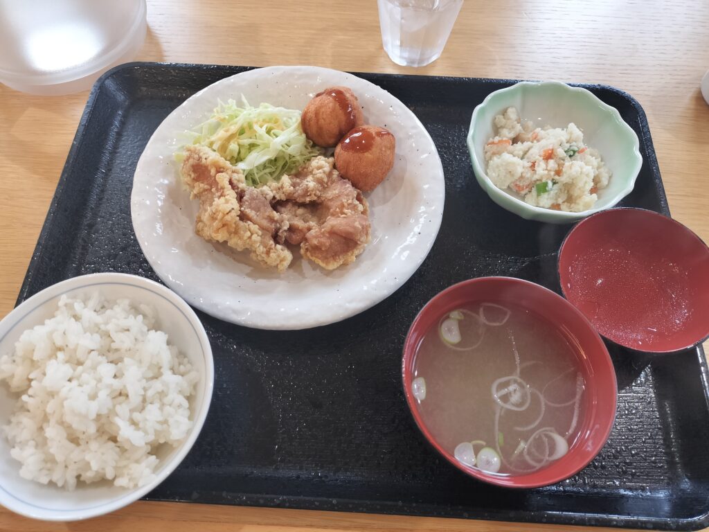 からあげ: 揚げたてサクサクで、お肉にしっかり味が染み込んでいます。ご飯が進む濃いめの味付けが最高!