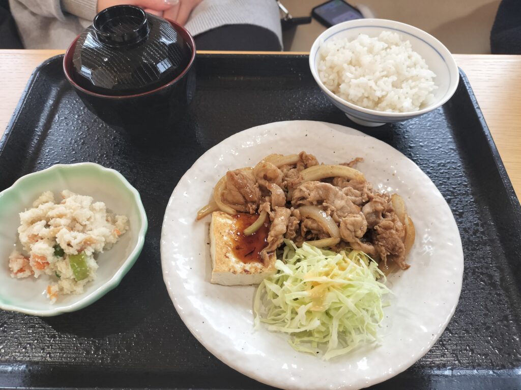 生姜焼きファンも納得の定食。メインの豚肉と玉ねぎの他に、焼き豆腐が添えられています。