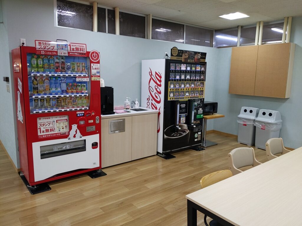 休憩所の一角には、飲み物の自動販売機(普通のコカ・コーラのと、GEORGIAのカップ自販機)があるのはもちろん、