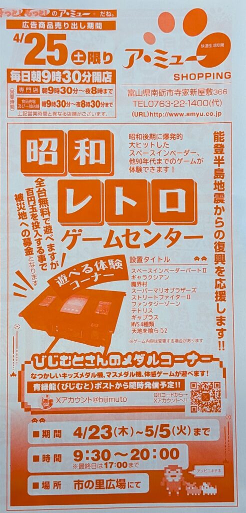 アミューのチラシにも、昭和レトロゲームセンターのこと、載ってました ^^