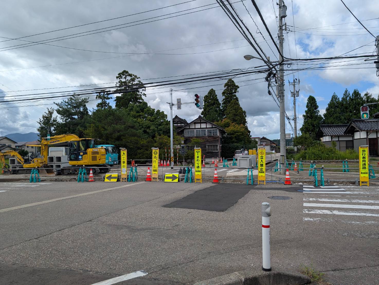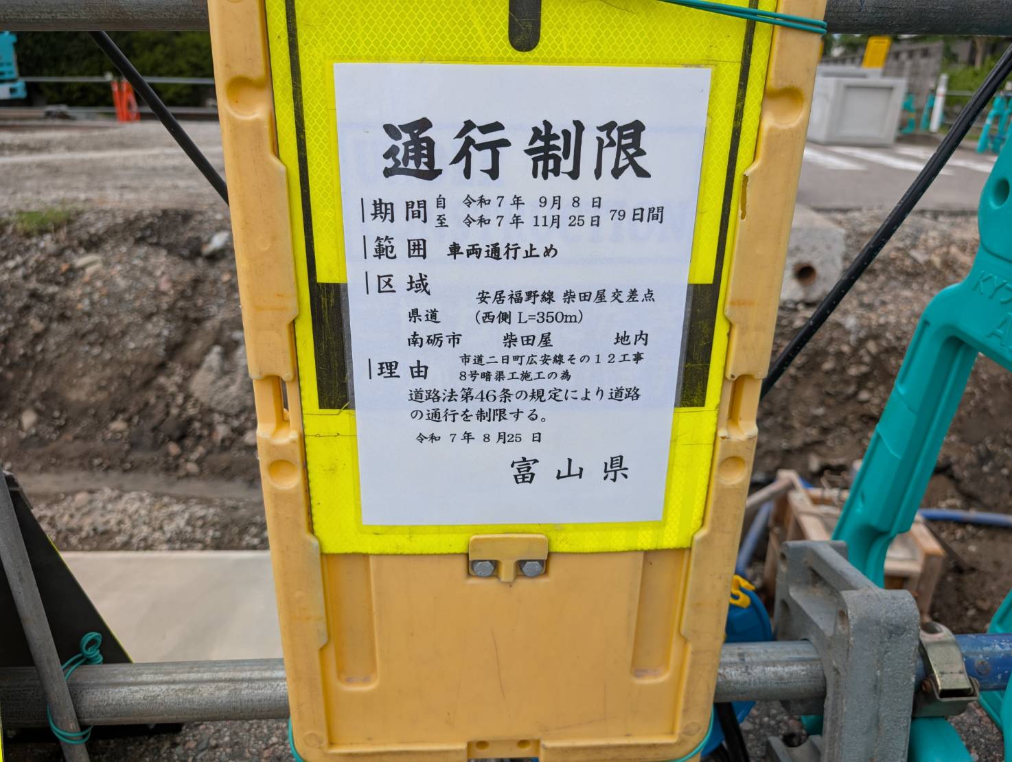 南砺市、福野地域の柴田屋地内で「道路工事に伴う通行止め」が発生してました。